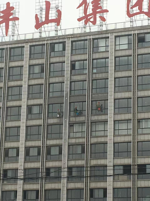首先,用專業(yè)清洗工具配合清潔劑清洗,清除外墻和玻璃上的污垢,然后用高壓清洗水槍,沖洗掉外墻上的污漬及污垢,并反復(fù)擦洗,用清水沖洗污垢,直至清洗到玻璃表面無積垢,